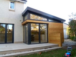Une petite extension de maison en ossature bois pour un aspect extérieur très jolie. Sans oublier des belles baies vitrées pour pouvoir sortir et rentrer facilement dans cette pièce supplémentaire. Cela rajoute du charme à la maison, ça ne fait aucun doute !