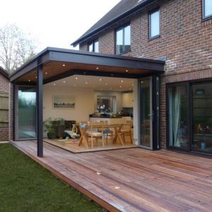 Une extension de maison avec cette fois ci ; deux baies vitrées panoramiques. A la différence que vous avez là, un toit avec des lumières industrielles. Un joli projet bien réalisé sur une belle terrasse de plein pied en bois.